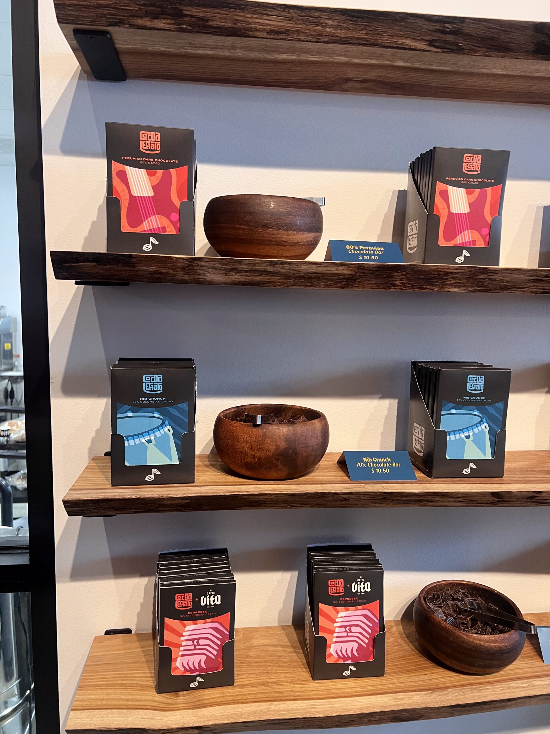 There’s a little stage in the cafe for live performances, and the factory/kitchen portion is visible through a glass wall. Music and chocolate iconography are creatively blended throughout the design of the store. It’s obvious so much careful thought was put into the whole design (Legato is a music dynamic that means “smooth”).