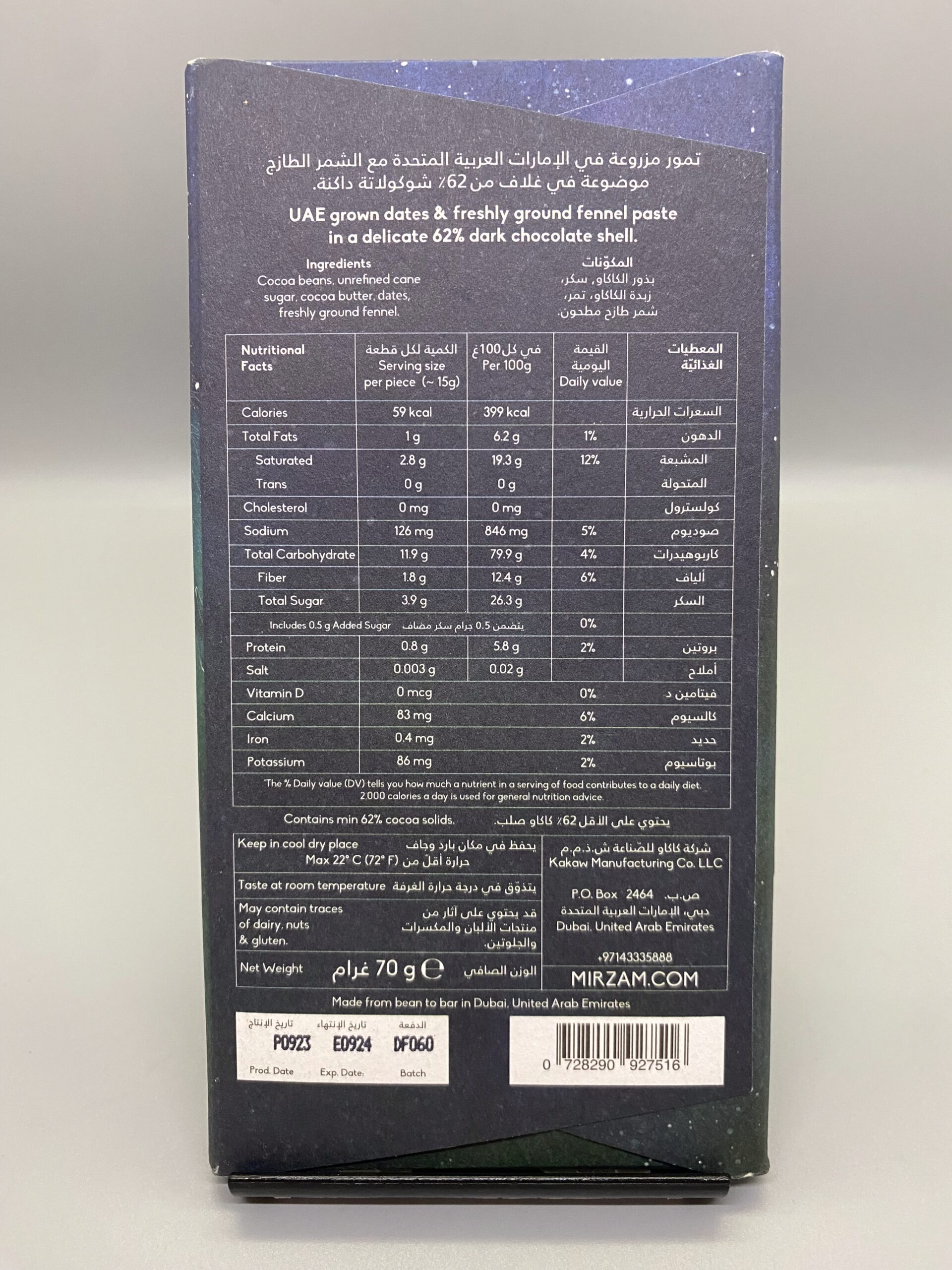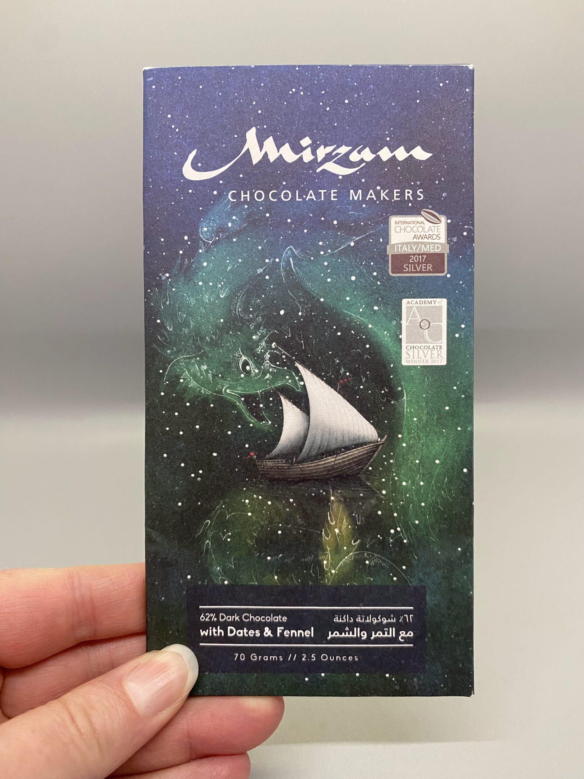 Dates & Fennel in 62% Dark Chocolate by @mirzamchocolate