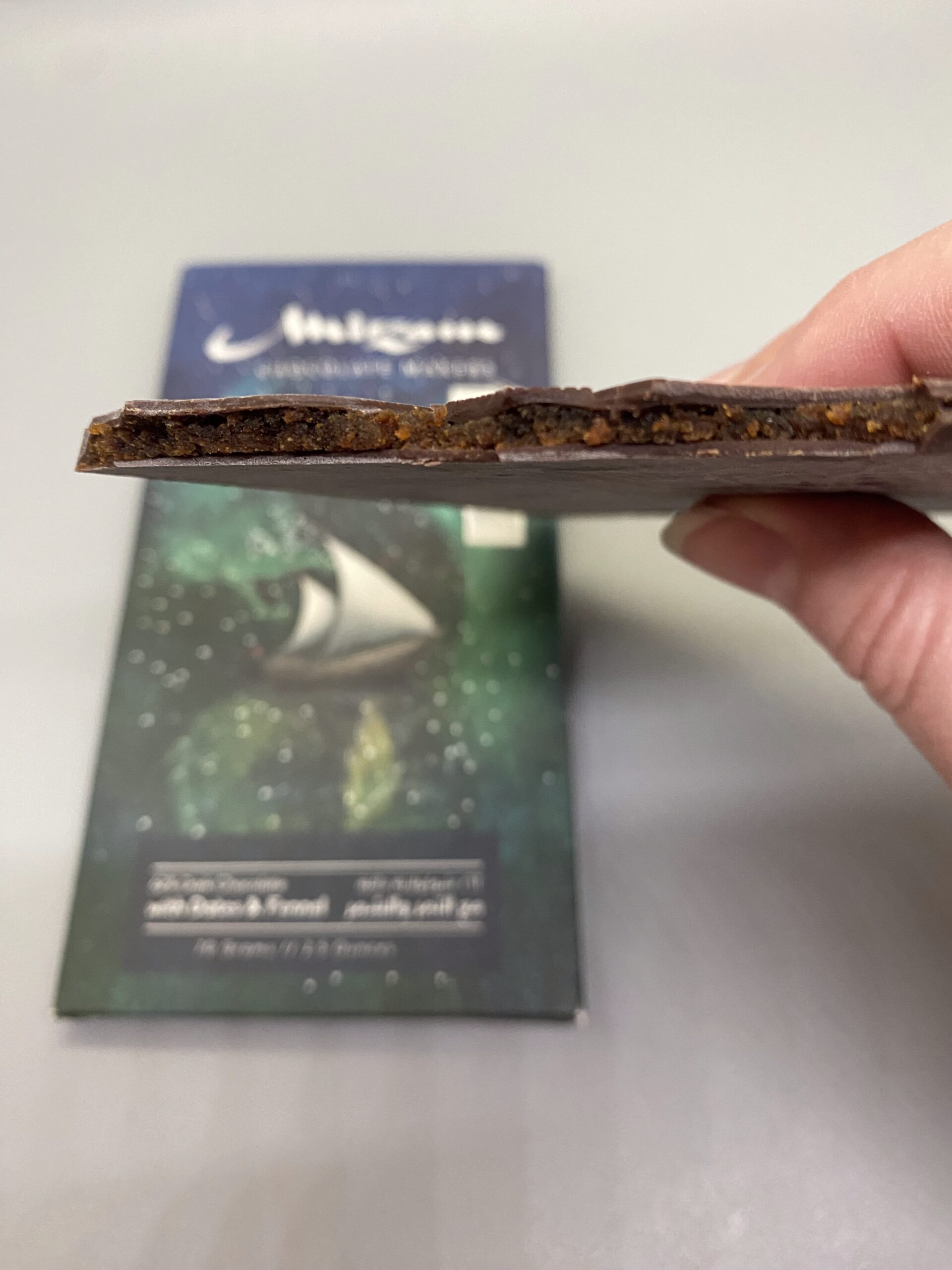This Mirzam date & fennel bar is especially delicious as it’s a filled bar- a delectable textured treat full of flavor in a thin chocolate bar shell. (How did they pack it in so neatly?)