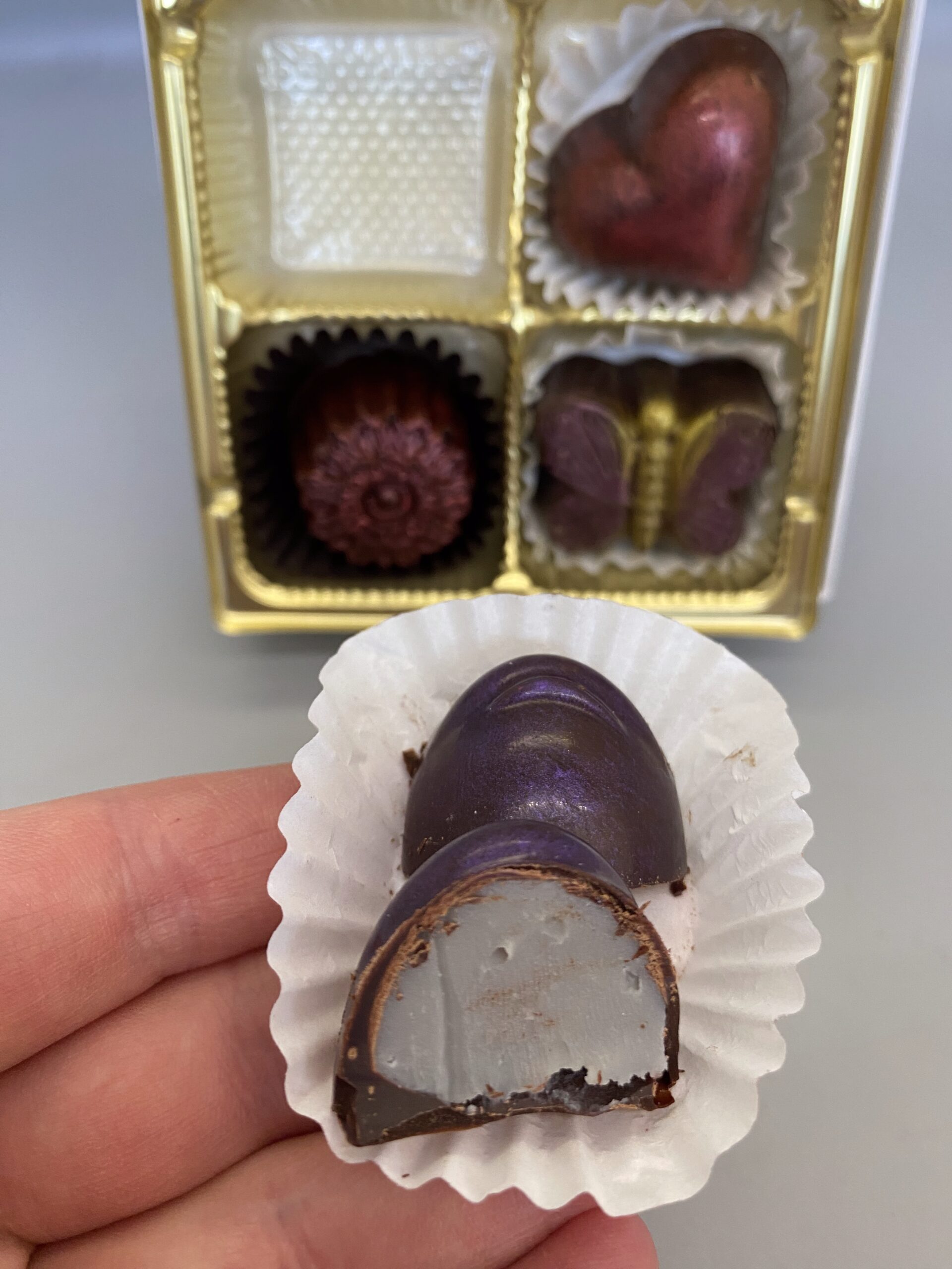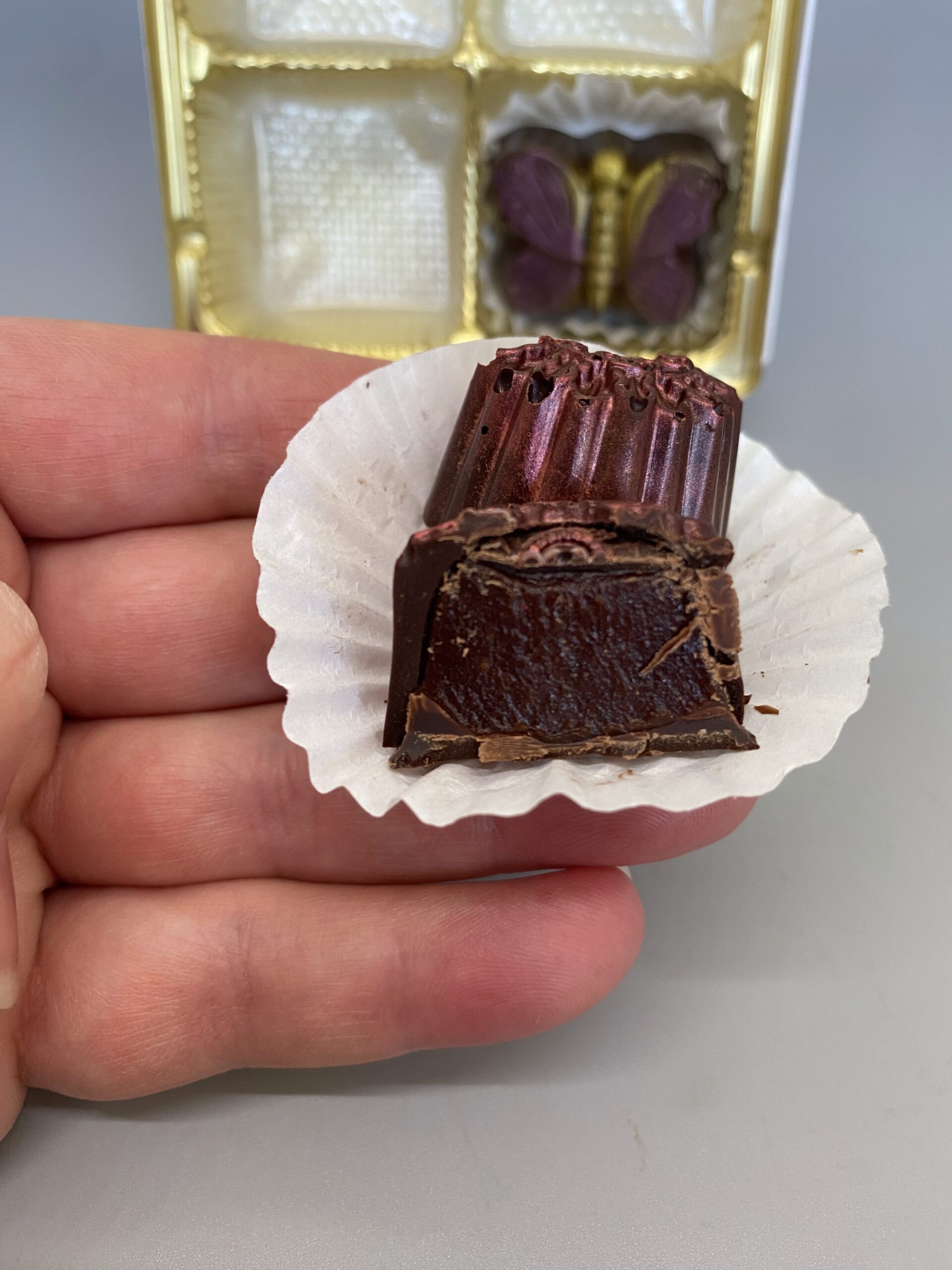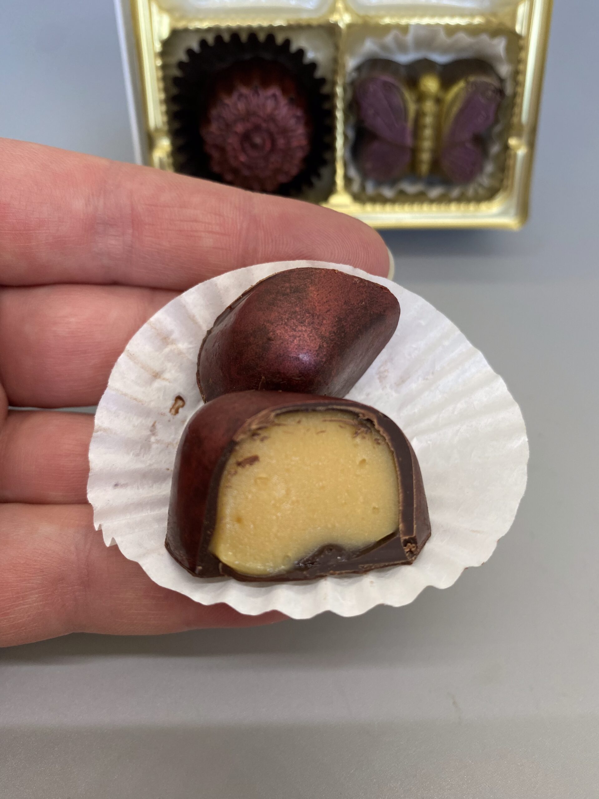 Overall these truffles are pretty well done with fairly thin shells (a big measure of care & skill when making them). Here are the four flavors: