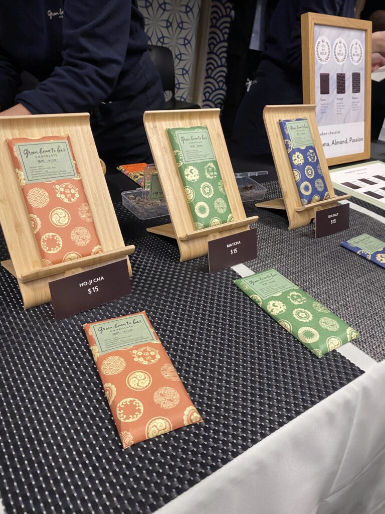 I spent the most money in one drop at Tokyo-based @greenbeantobar_chocolate at @nwchocolate festival, no regrets! They make an excellent product and had an impressive array of bars, including many interesting iterations of Peruvian origin. The Ho-Ji Cha bar (orange wrapper) had roasted green tea in milk Peruvian chocolate and was divine, as was the Bolivian milk chocolate. I’m very excited to try their fine looking confections (bon-bons) as well- I’ll share more soon!