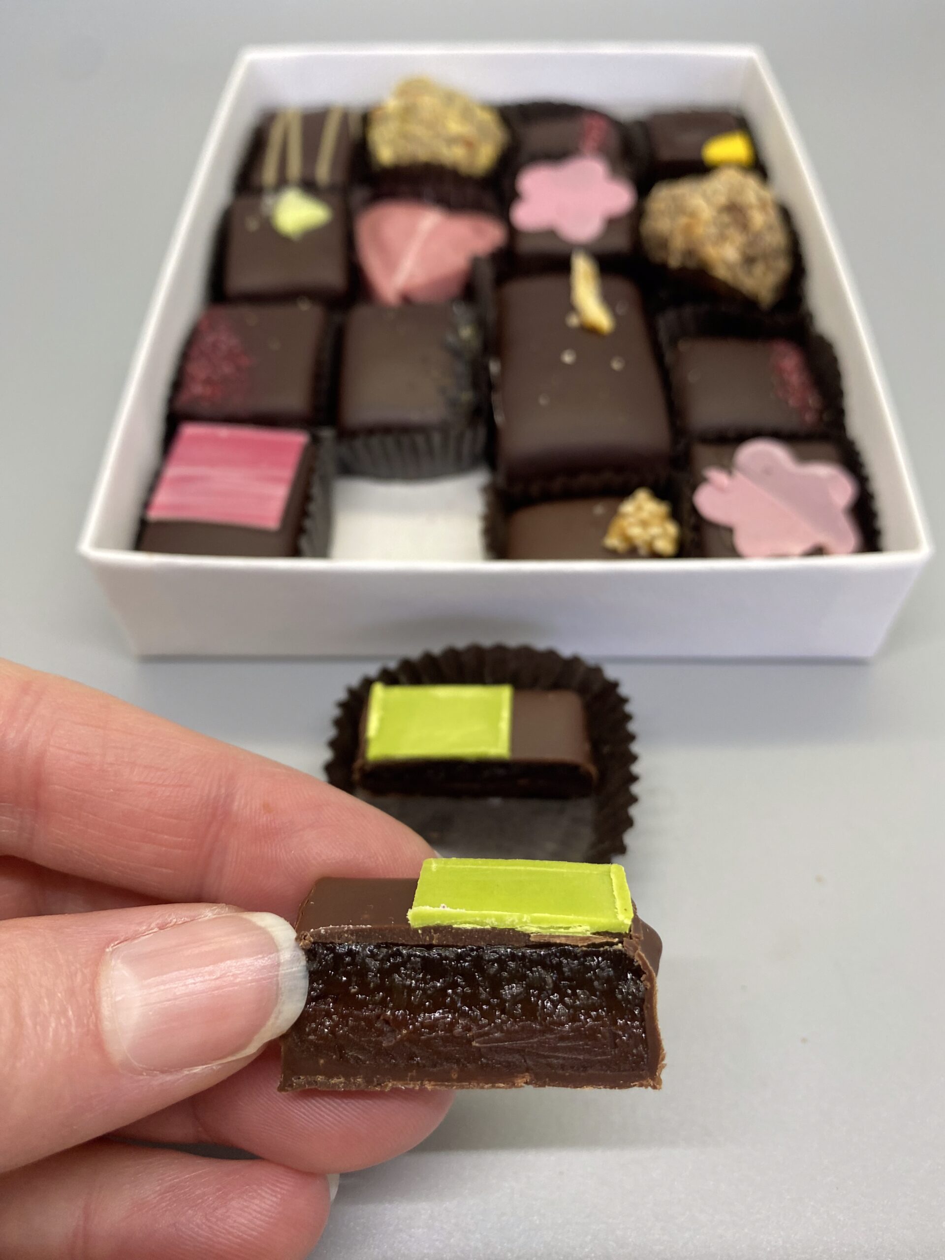 🍐 Pear balsamic- A lovely textural pairing of ganache with pâté de fruit. But, the pear is very faint, and no balsamic flavor at all. Another disappointment.