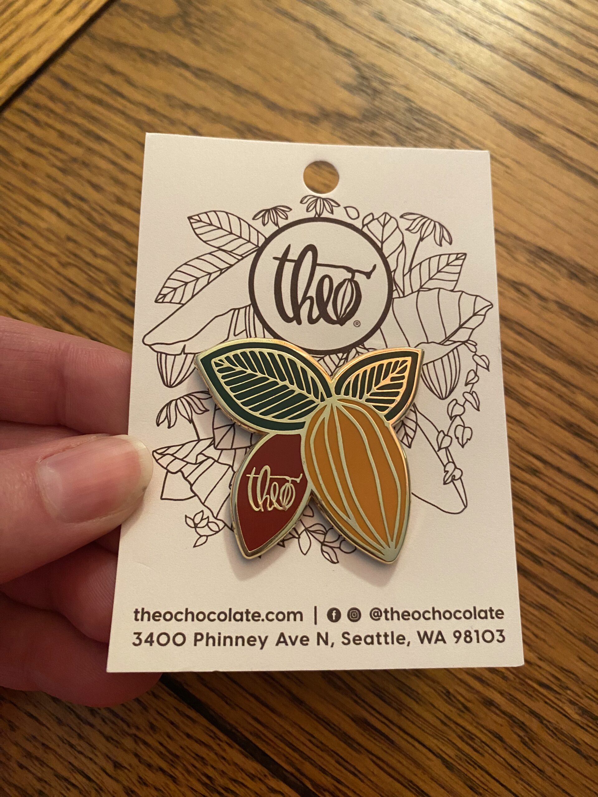My friend @mquinnaud was gracious enough to pick me up some last-chance merch and chocolate from @theochocolate now-closed Seattle factory store earlier this month. So sad they’re closing but I will cherish this adorable cacao pod pin, among some other goodies.